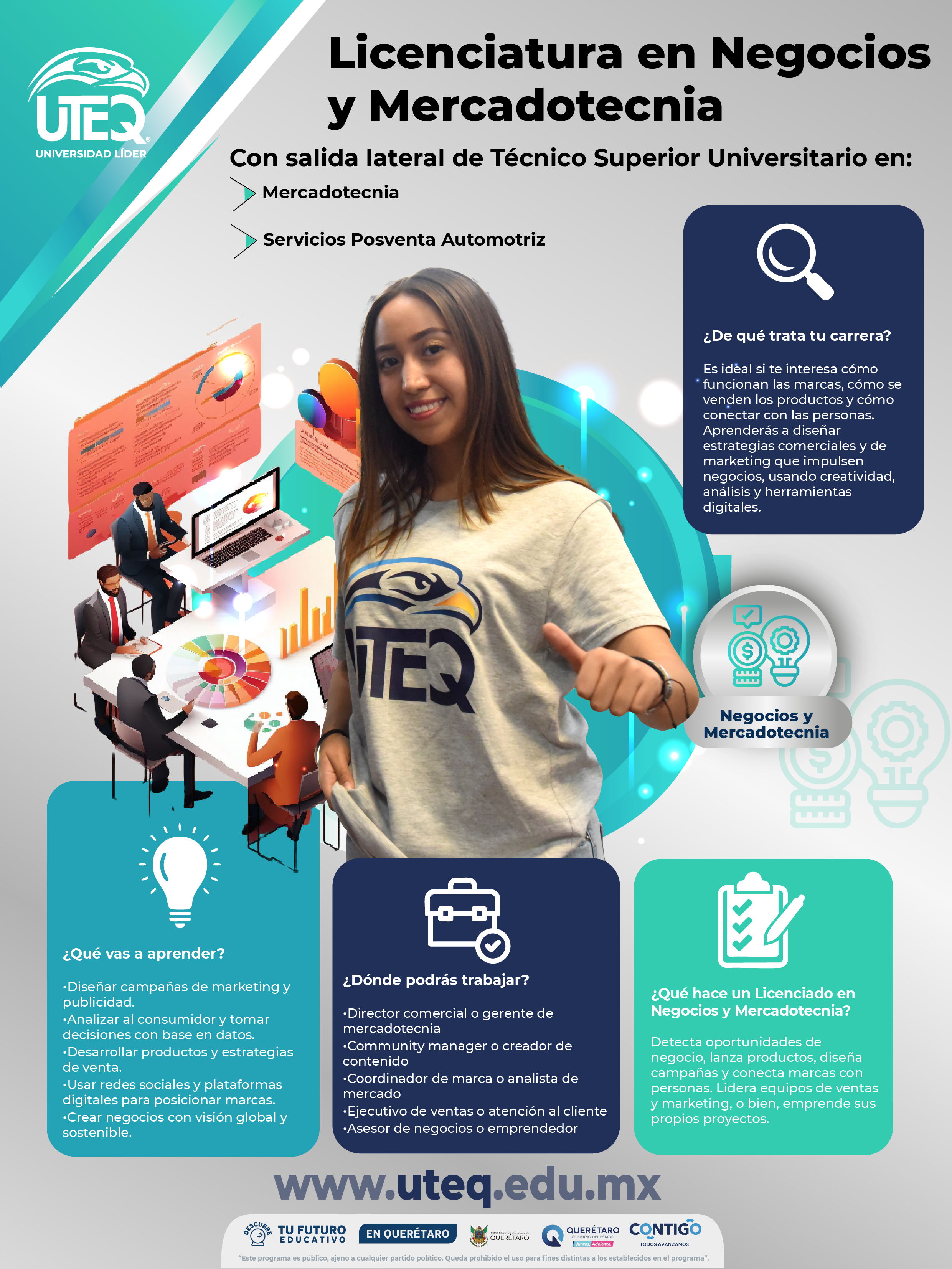 El Licenciado en Negocios y Mercadotecnia se distingue por poseer las competencias profesionales esenciales que respaldan su desempeño con éxito en el dinámico entorno laboral, abarcando tanto el ámbito local como el regional y nacional. Este perfil integral no solo se ajusta a las demandas actuales del sector, sino que también anticipa y se adapta a las transformaciones y desafíos emergentes de la Licenciatura en Negocios y Mercadotecnia. Su capacidad para integrar conocimientos técnicos especializados, habilidades analíticas y una visión innovadora lo posiciona como un profesional altamente cualificado y preparado para contribuir significativamente al avance de la disciplina y a la resolución eficiente de problemáticas complejas en distintos contextos.