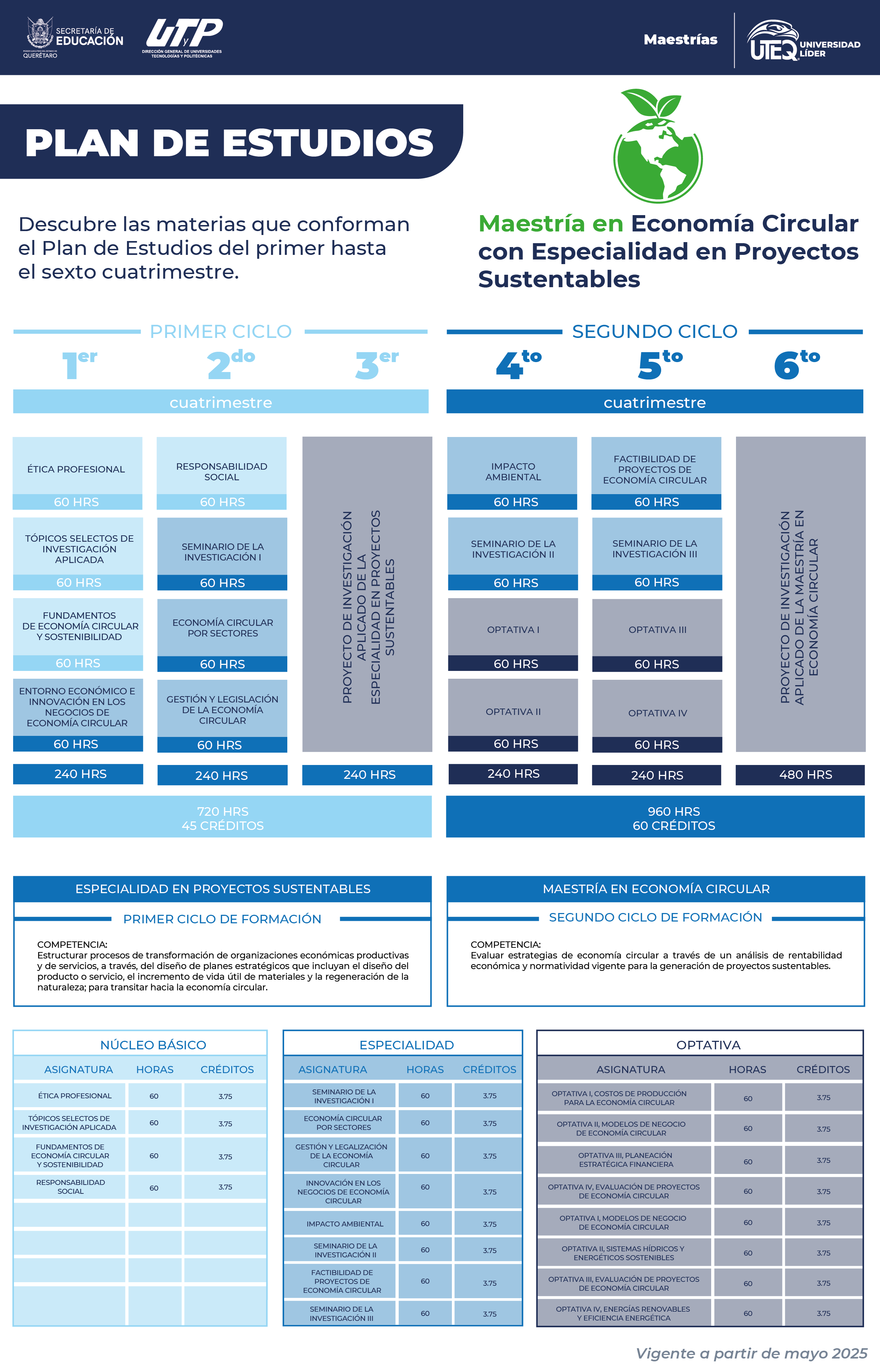 - Créditos Académicos: El programa totaliza 105 créditos (45 en el primer ciclo y 60 en el segundo), distribuidos en materias de 60 horas cada una.