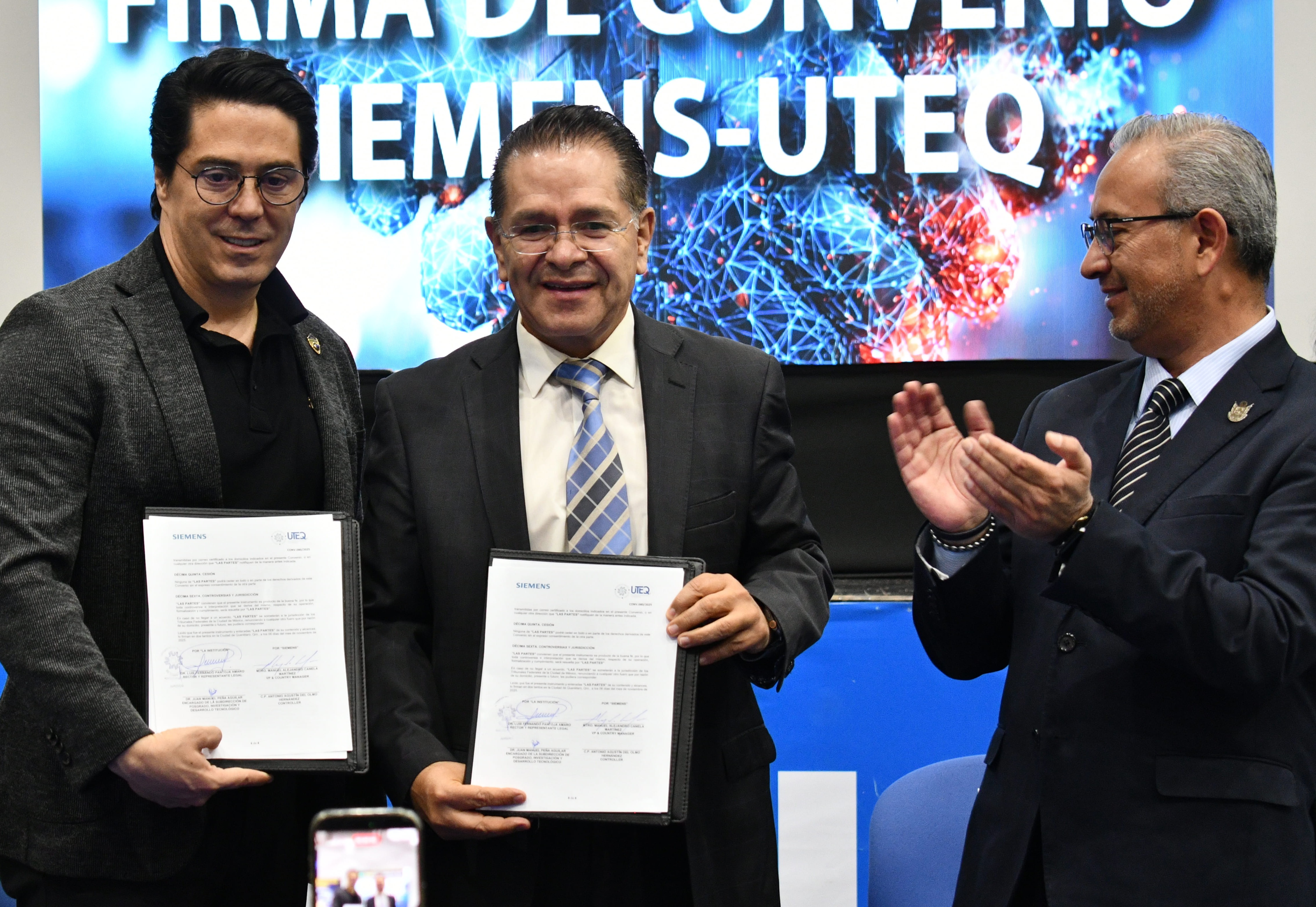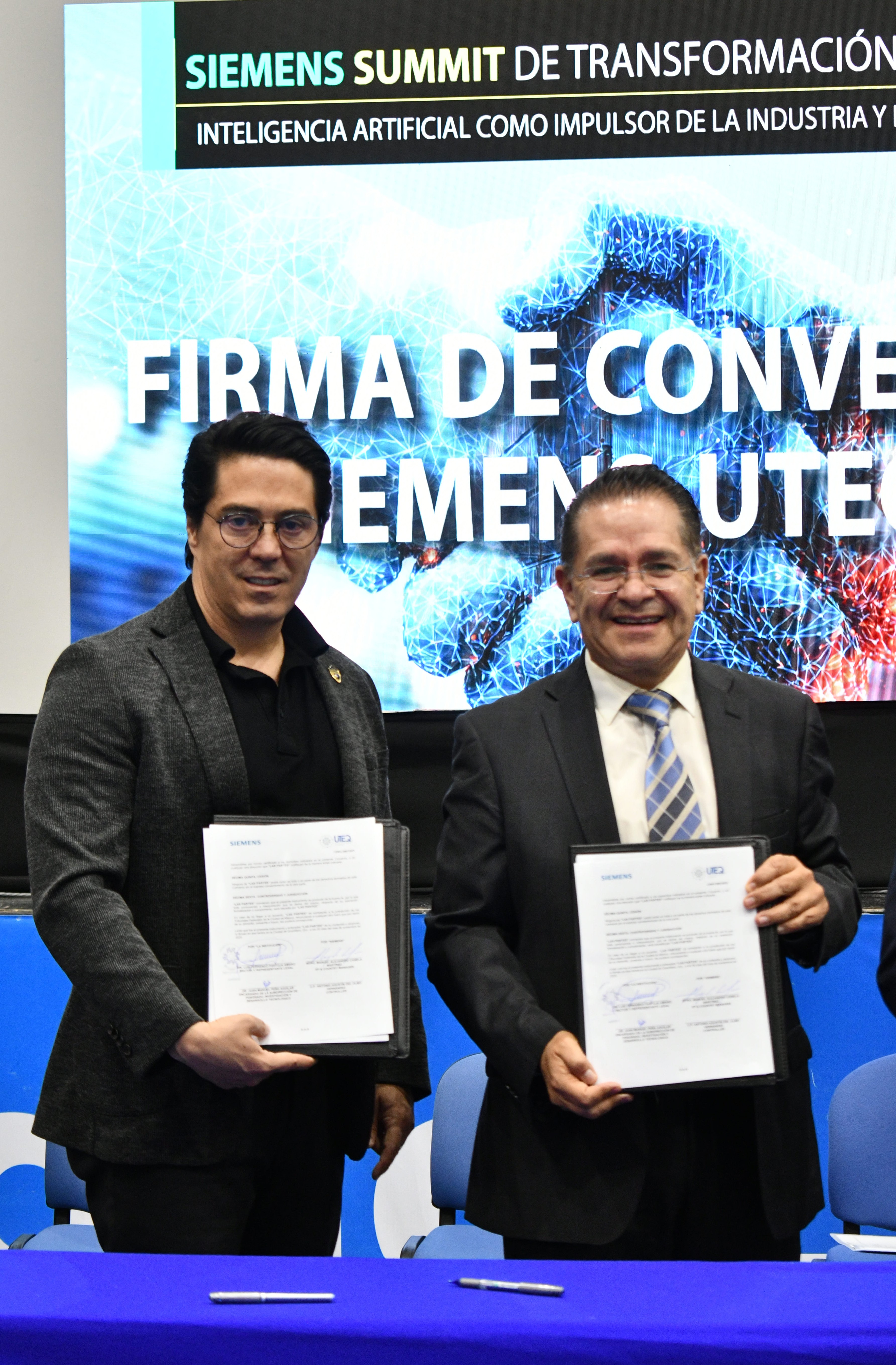 El rector de la Universidad Tecnológica de Querétaro (UTEQ), Luis Fernando Pantoja Amaro, y el presidente-director general de Siemens en México y Centroamérica, Alejandro Canela, renovaron la alianza que ambas instituciones mantienen desde hace ocho años y que ha permitido la certificación de más de dos mil 300 estudiantes en programas especializados en tecnologías de la industria 4.0, lo que contribuye positivamente en su desempeño académico y profesional.